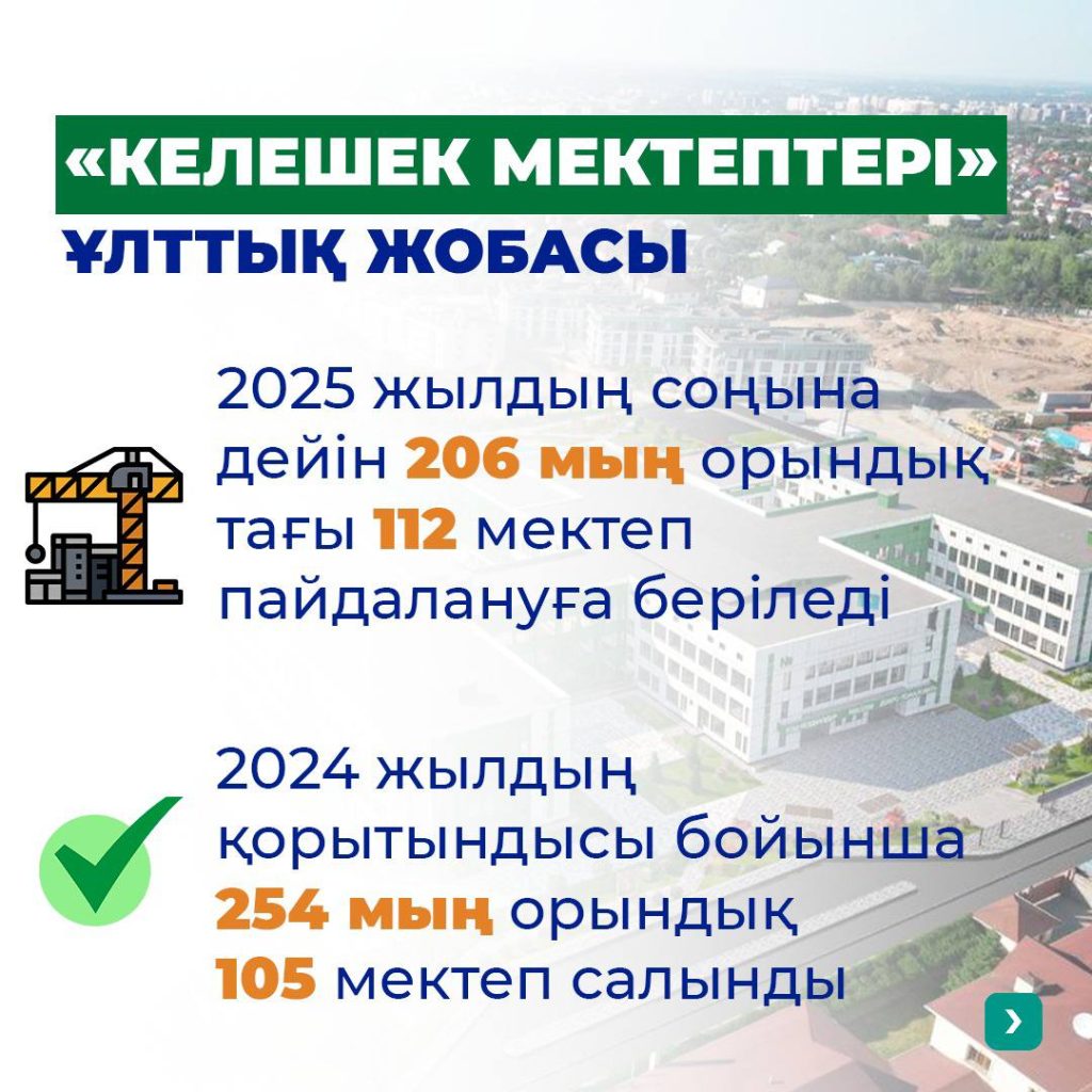 Жоба аясында тек Алматы қаласында 2024 жылы 22 мың оқушыға арналған 7 мектеп салынды, тағы 14 мектеп осы жылдың соңына дейін салынады.