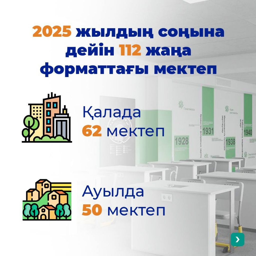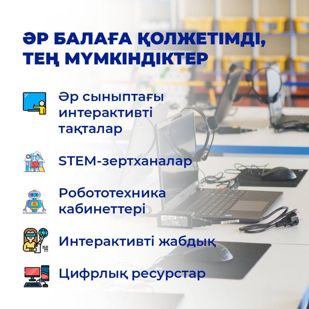 Елімізде Мемлекет басшысының бастамасымен «Келешек мектептері» ұлттық жобасы қарқынды жүзеге асырылуда. Әр мектепте робототехника кабинететері, STEM-зертханалар, хореография залдары, коворкинг аймақтары, 4 спорт залы бар, заманауи пәндіктер кабинет, алғашқы әскери дайындық үшін арнайы ашық алаңдар қарастырылған